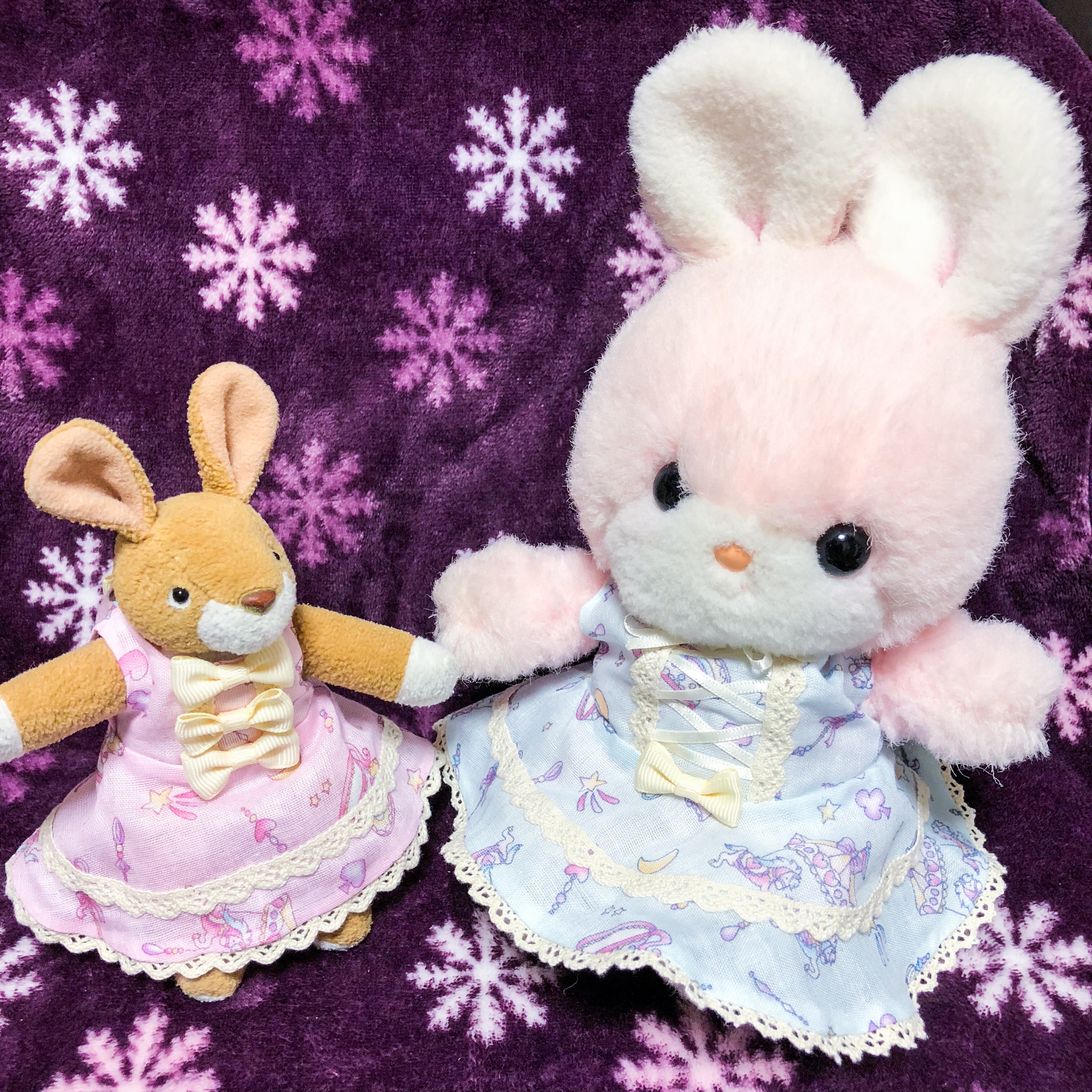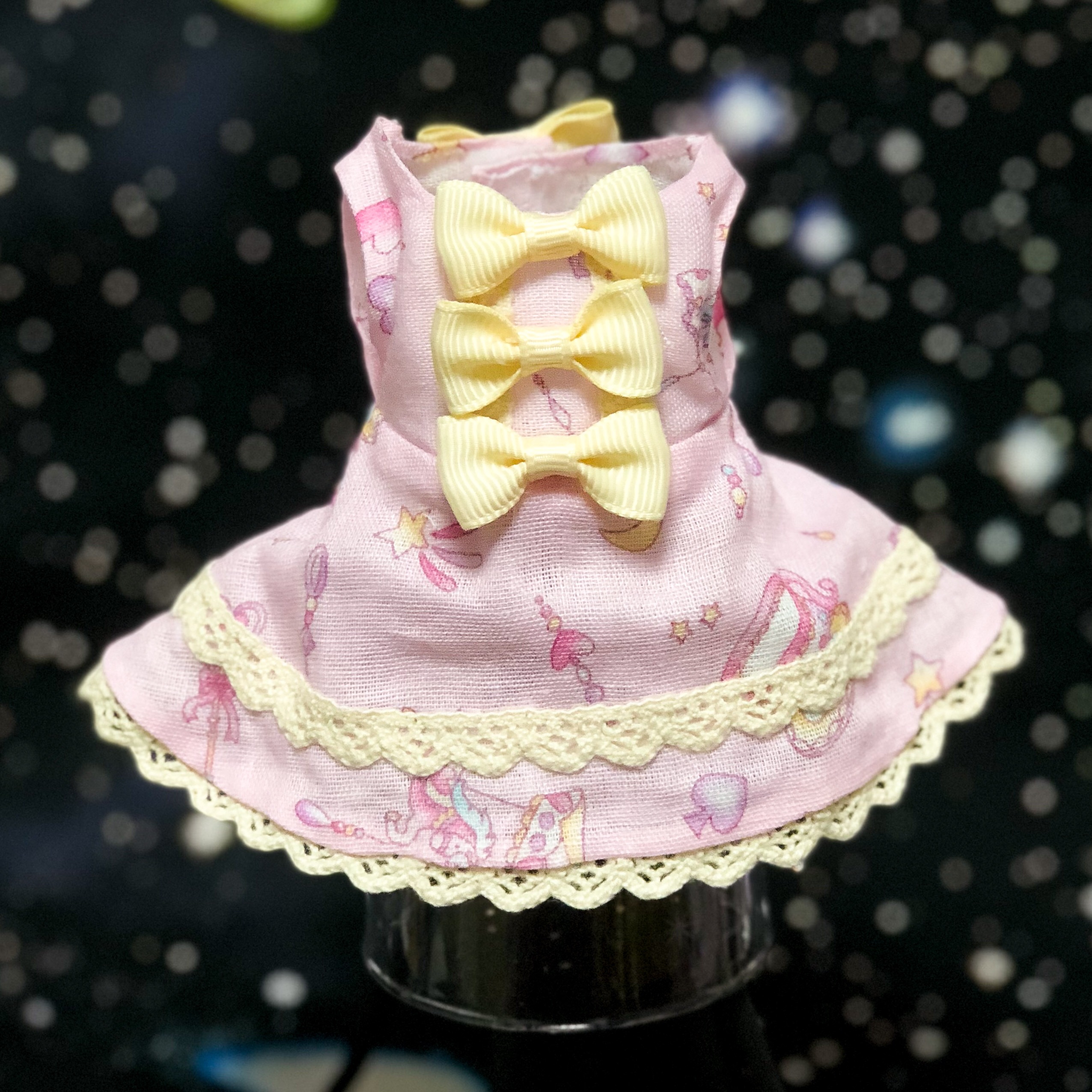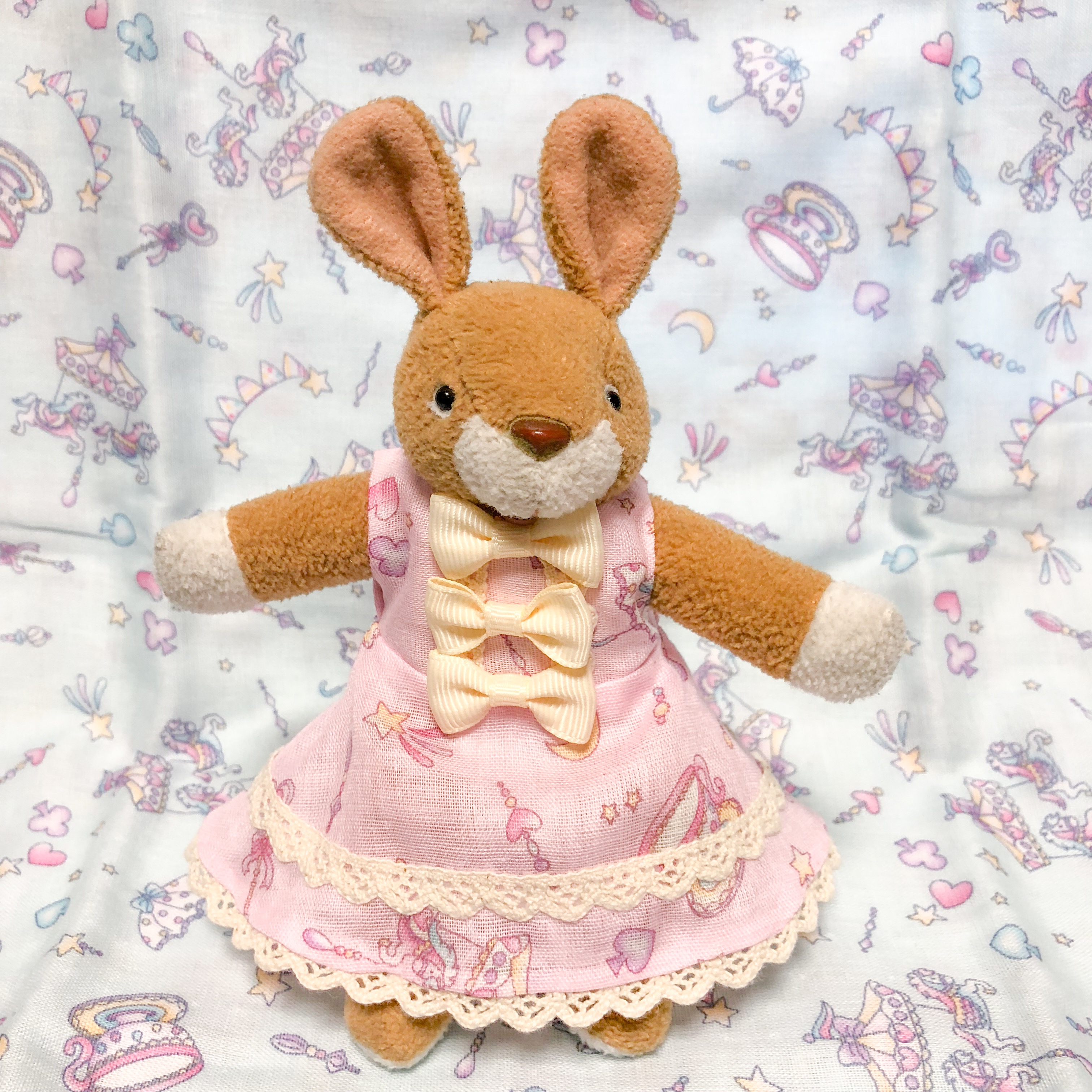 3個のリボンがポイントのロリータ風デザインです。 スカート部分はレースが2段使いになっています。 モデルはうさみさん。 身長15cm(耳含まず) 基本お洋服サイズSS(15~17cm)